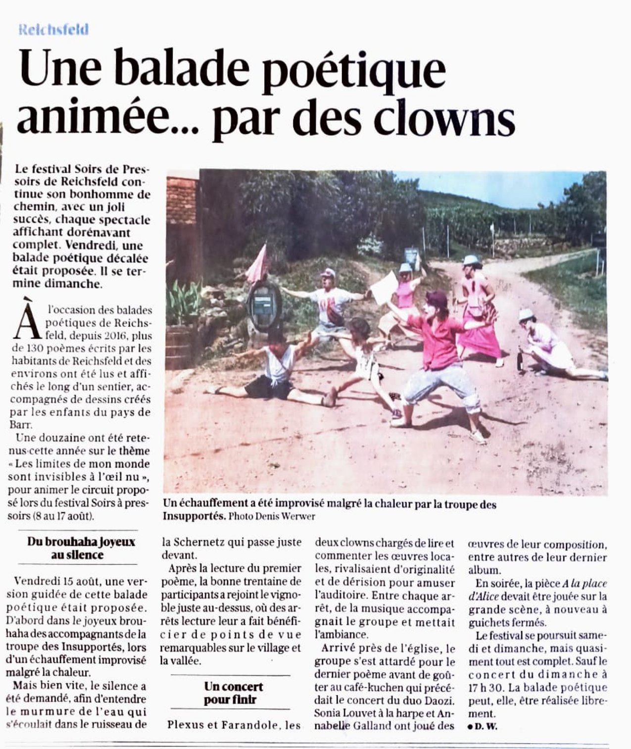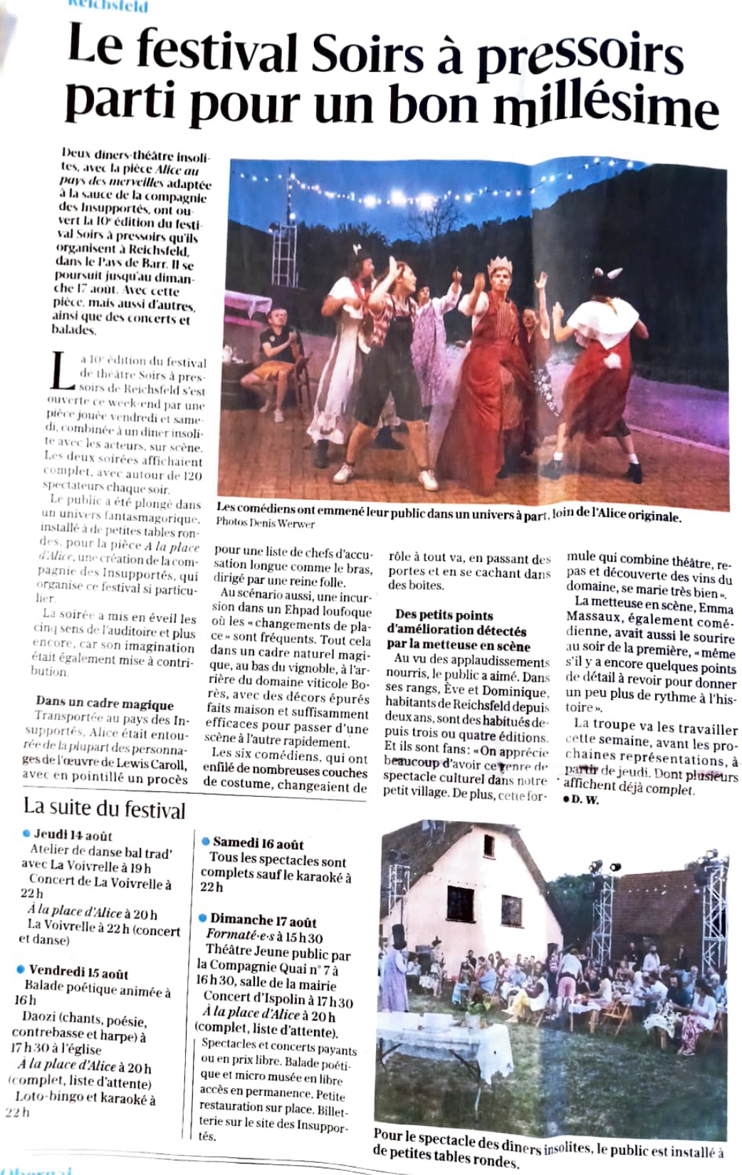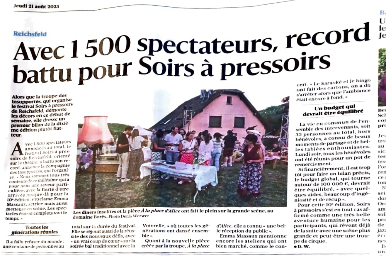 Presse la presse en parle 21.08.2025Dernières Nouvelles d’AlsaceAvec 1500 spectateurs, record battu pour Soirs à pressoirs 11.08.2025Dernières Nouvelles d’AlsaceLe festival Soirs à pressoirs parti pour un bon millésime 16.08.2025Dernières Nouvelles d’AlsaceUne balade poétique animée… par des clowns 08.08.2025Dernières Nouvelles d’AlsaceLe pari réussi d’un festival de théâtre pro dans un tout petit village 31.07.2025Dernières Nouvelles d’AlsaceLes Insupportés revisitent Lewis Carroll à Reichsfeld 21.08.2024Dernières Nouvelles d’AlsaceLes très bon bilan de la 9ème édition de Soirs à Pressoirs 15.08.2024Dernières Nouvelles d’AlsaceUne belle entame pour les Soirs à Pressoirs 17.08.2024 Dernières Nouvelles d’AlsaceSoirs de pressoirs continue de séduire et surprendre 07.2024PokaaFestival “Soirs à Pressoirs” à Reichsfeld 06.2024Dernières Nouvelles d’AlsaceLes habitants invités à laisser libre cours à leurs inspirations